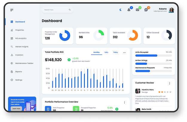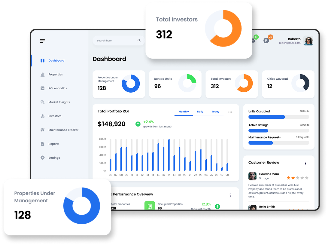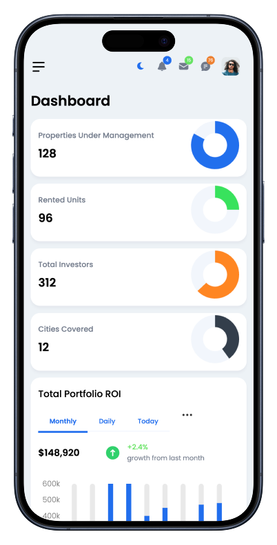 Visualize portfolio performance, analyze ROI trends, and uncover hidden opportunities using an AI-enabled investment dashboard designed for real estate growth and risk control.