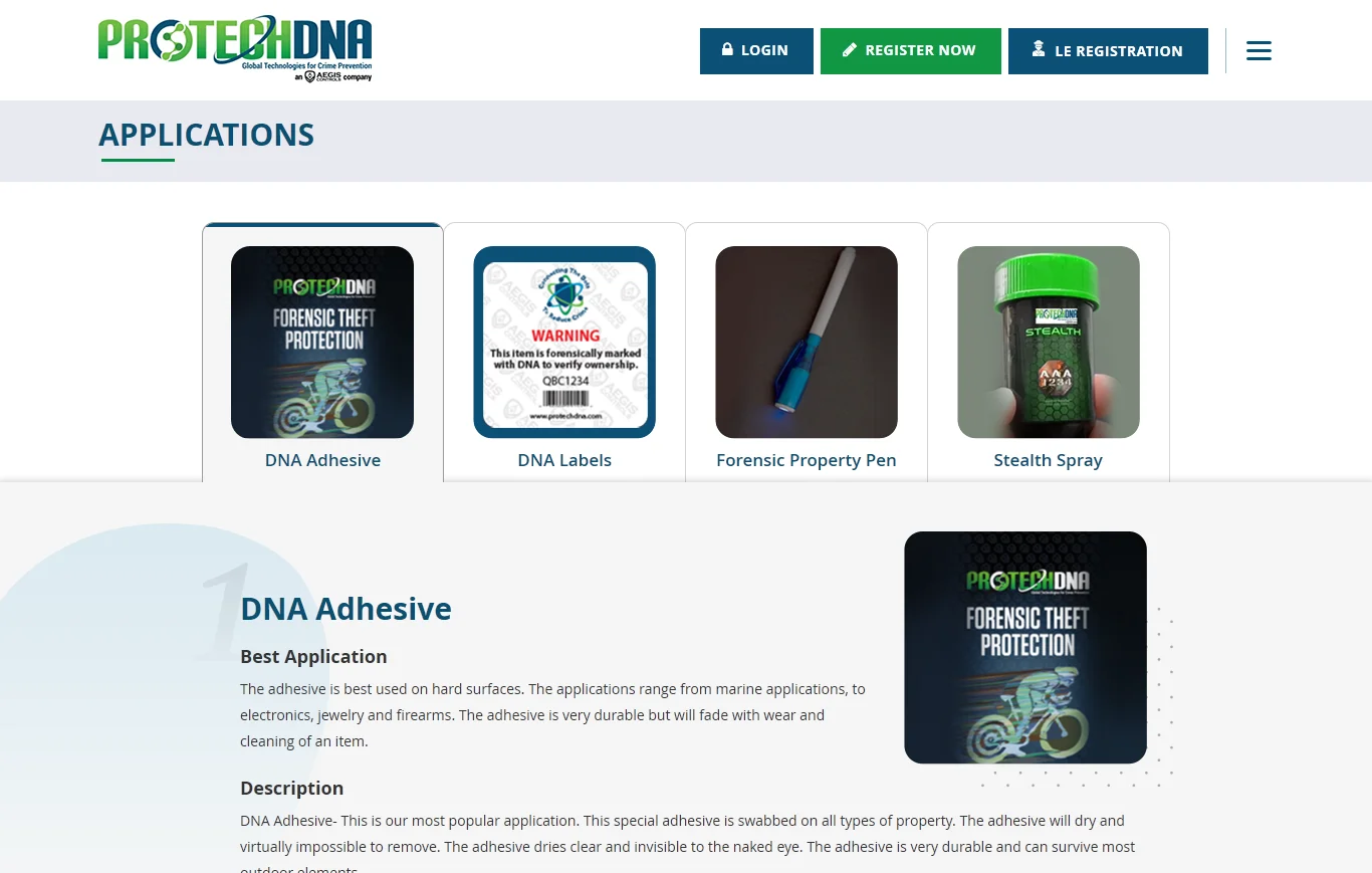 Nothing worries you more than your valuables being stolen, or them being sold off at any pawn shop. But you can now stay calm and composed cause ProtechDNA will ensure your belongings are safe and secure. ProtechDNA kit constitutes of an adhesive with thousands of microscopic nickel dots. These dots comprise of your PIN(Personal Identification Number) which will glow under Dark/UV Light, so the law enforcement agencies could identify the owner of the property.