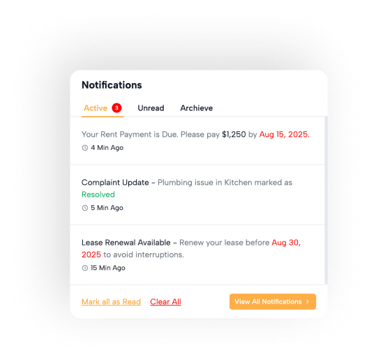 Get notified for due rents, expiring contracts, or compliance updates via email, SMS, or in-app.